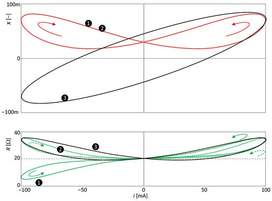 Thus, the index of the last zero member of the sequence is 1, which is also the order of touching of the PHL arms at the origin. The loop in Figure 6 is therefore of the NCT(1) type, although it consists of two distinctly isolated lobes. The cause of this phenomenon is the behavior of the state variable iL, which does not respond to changes in the voltage excitation for a long time, as shown by the SIL curve in Figure 7. The term Δ2, which affects the order of the touching of the arms, therefore has a very small value. Further analysis shows that all subsequent terms with even indices will also have negligible values since their magnitude will be proportional to the steepness of the i-th order of the SIL curve for v = 0. The two arms only become significantly “unlinked” when terms significantly different from zero begin to appear in the sequence {Δi}. Hence, it seems from the extreme isolation of the two lobes that the order of touching is much higher than 1. For higher excitation frequencies, this effect is not as pronounced, and the PHL shape changes compared to Figure 6. However, the type II central symmetry is preserved, as shown in the original paper [88].