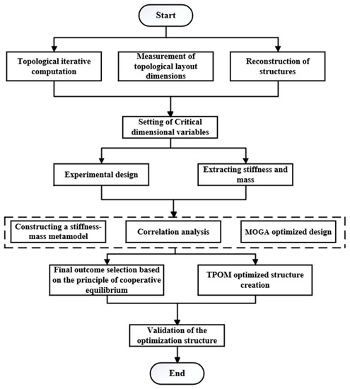 To address the integrated optimization problem between topology and dimensional parameters in serial robots, this study proposes TPOM. First, the lower arm component of the serial robots with the most adverse working conditions was selected as the research subject. The constraints and load conditions of this component were determined. Through topology iteration, the layout of the structure was obtained. Then, the dimension information from the topology layout was extracted for reconstructing the structure. Subsequently, the Box–Benhnken experimental design (BBD) [35] obtained components with different specifications. The stiffness–mass metamodel was established by utilizing ANSYS software to extract the stiffness matrix of the experimental components. Based on this, the deformation of the entire component was analyzed. Pearson correlation analysis used SPSS software to explore the relationship between critical variables and stiffness. Finally, the multi-objective genetic algorithm (MOGA) was used to optimize the critical variables. The structure was reconstructed based on the optimization results, and the structure was embedded in a stiffness–mass metamodel for analysis. The optimization structure was then validated, and the results indicate that the TPOM method effectively addresses the integrated optimization of serial robot components.