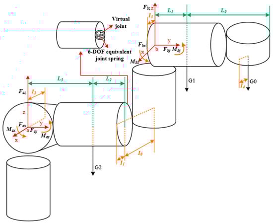 As serial robots are composed of links and joint structures, the overall flexibility of the robot can be represented as the flexibility of the links and joints. Here, the virtual joint method is considered for analyzing and describing the flexibility of the lower arm components, thereby obtaining the structural stiffness. The method involves incorporating an equivalent virtual spring at the end of the lower arm structure to represent the flexibility and coupling between different deflections of the lower arm components. The influence of gravity on the lower arm is neglected for the convenience of the study. In the analysis of the lower arm, it is assumed that each component is linearly elastic. According to Hooke’s law, in an elastic system, there is a linear relationship between the force on the virtual joint and the corresponding deflection. When the virtual joint is subjected to external forces, it generates reactive forces proportional to the deflection. This means that if the applied external force increases, the deflection of the virtual joint also increases accordingly.