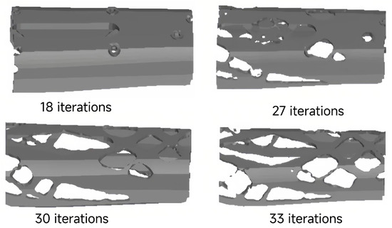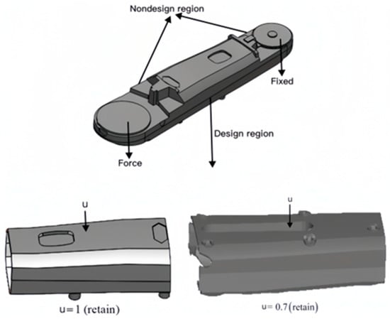 In the design domain of structure, the density of each element is independently designed to alter the material distribution of the structure and generate a topological layout. To obtain the desired topological layout, iterative calculations are performed within the overall mass domain [0, 1] of the lower arm. Different mass retention rates () for the components are set, with a specified range of mass variation of = 0.05. The objective function is set as the compliance () of the component, and the mathematical model for topological optimization is expressed by Equation (10).