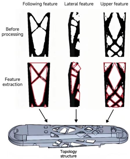 After iterative calculations, the topology structure exhibits irregular shapes and rough edges, making it unsuitable for direct manufacturing. A new method is proposed to make the post-topology dimensions as close as possible to the actual results. This method is based on edge detection and utilizes a measurement program to obtain the dimensions of the topological layout. Edge detection primarily involves the following steps: (1) binary processing of the topological image; (2) calculation of multiple gradients using the Sobel operator, followed by weighted summation; (3) normalization of the convolution results to obtain an edge map; (4) identification of regions in the image where pixel values undergo significant changes, enabling the detection and extraction of these edge features; and (5) computation of gradient magnitudes for each pixel.