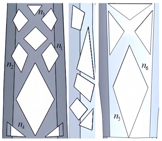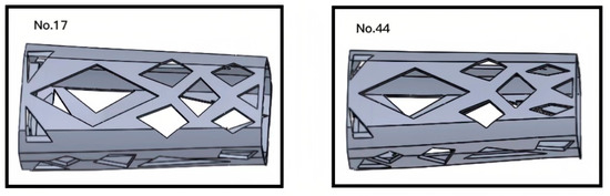 In Figure 9, and represent the linear stiffness and angular stiffness of each experimental group, respectively. Among them, the structures of experimental groups 17 and 44 as to design domains is shown in Figure 10. According to the results, it was found that the X-, Y-, and Z-directional stiffness values of the lower arm component generally exhibit consistent trends. As the mass increases, the stiffness may decrease, indicating a nonlinear relationship between mass variation and overall stiffness. For the non-cuboid structure of the lower arm, the linear stiffness is highest on the Z-axis and lowest on the X-axis, in contrast to the angular stiffness. The angular stiffness of the lower arm reaches its maximum along the X-axis and its minimum along the Z-axis. The study reveals that the stiffness along the Y-axis falls between the values observed along the X and Z axes. Moreover, the stiffness values in these three directions do not influence one another, and no noticeable pattern or regularity emerges among the stiffness values in different directions, indicating significant differences.