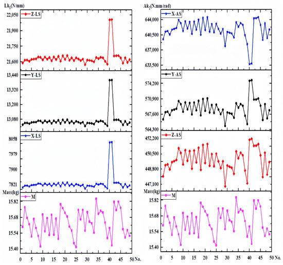 In the above equation, and are the critical variables in . , denote second- and third-order nonlinearities. is the interaction term for any two parameters, and , , , , is the regression coefficient for each term. The BBD experimental design was established in the study above, in which each experimental group variable corresponded to a mass. The stiffness matrix corresponding to the mass was obtained by analyzing and calculating each experimental group. The stiffness–mass metamodel of the component is shown in Figure 9, below.
