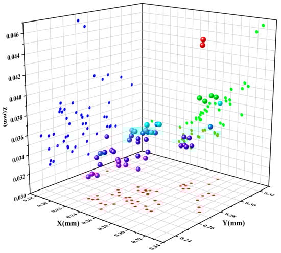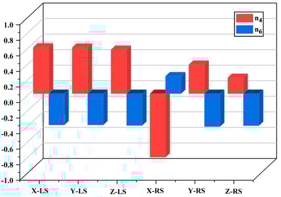 In the context of vertical comparisons, the study reveals that experimental groups with varying dimensional parameters display distinct trends in stiffness and mass alterations. There appears to be a correlation between maximum mass and minimum stiffness. Similarly, linear stiffness variations along the X, Y, and Z directions exhibit consistent trends in transverse comparisons. However, angular stiffness demonstrates dissimilar variations. An increase in angular stiffness along the X-axis corresponds to a decrease in angular stiffness along the Y-axis and Z-axis. Furthermore, the stiffness displays significant discrepancies and abrupt shifts in structures sharing similar dimensional parameters. Building upon the stiffness–mass metamodel, the deformations of each group’s critical variable structure were investigated. Figure 11 illustrates the deformations in the X, Y, and Z directions.