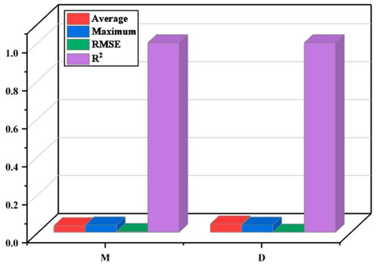 A value closer to 1 indicates higher fitting accuracy. Conversely, a minor root mean square error (RMSE) is desirable. The results (Figure 13) demonstrate excellent fitting accuracy. Specifically, values are greater than 0.9, RMSE is less than 0.2, the average value is less than 0.2, and the maximum value is less than 0.3. M represents the fitting accuracy for mass, while D represents the fitting accuracy for deformation. Due to the overall high fitting accuracy, the fitted quadratic polynomial can be used as the objective function expression for optimization design.