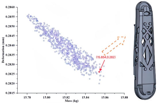 In this study, the MOGA (multi-objective genetic algorithm) and cooperative equilibrium principles were employed to select critical variables for the lower arm component. The MOGA method combines the characteristics of genetic algorithms and multi-objective optimization techniques. To ensure algorithm convergence, an initial sample size of 6000 was established, generating 1200 samples at each iteration. The best individual accounted for 0.7 of the population, and the maximum number of iterations was set at 20. A subset of the optimization results constituted the Pareto frontier, which was subsequently analyzed using a dimensionless approach for objectives on this frontier. This approach enabled the determination of the optimal distance to the ideal point. Furthermore, the concept of cooperative equilibrium was utilized to identify a state that closely approached the ideal value through a balanced consideration of various interests. The cooperative equilibrium points for mass and deformation were 15.854 kg and 0.282 mm, respectively. The optimization results for the critical variables are presented in Figure 14 and Table 2, respectively.