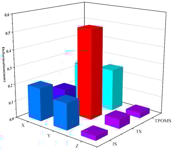 Specifically, under the same constraints, the stiffness values in the three directions of the lower arm component significantly impact the overall deformation. The total deformation of the lower arm varies with changes in the stiffness values in the X, Y, and Z directions. Notably, the stiffness in the Z-direction is more significant than in the other directions, and therefore the deformation in that direction is smaller. The deformation of the initial structure (IS) of the lower arm, the topologically optimized structure (TS), and the TPOM structure (TPOMS) are depicted in Figure 15.