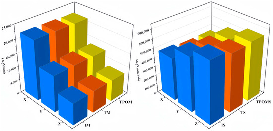 To further investigate the TPOM, Figure 14 compares the structures’ linear stiffness and angular stiffness. The results show the following: (1) The linear stiffness values in the X, Y, and Z directions tend to be equal, with little variation in fluctuations. (2) Among the angular stiffness values in the X, Y, and Z directions, the angular stiffness along the Z-axis is the highest. The TS exhibits the lowest angular stiffness of all three directions, contributing to the excessive deformation. (3) TPOM optimization reduces the mass of the parts by 15%, and the linear stiffness values in the X, Y, and Z directions are approximately equal to that of the IS.