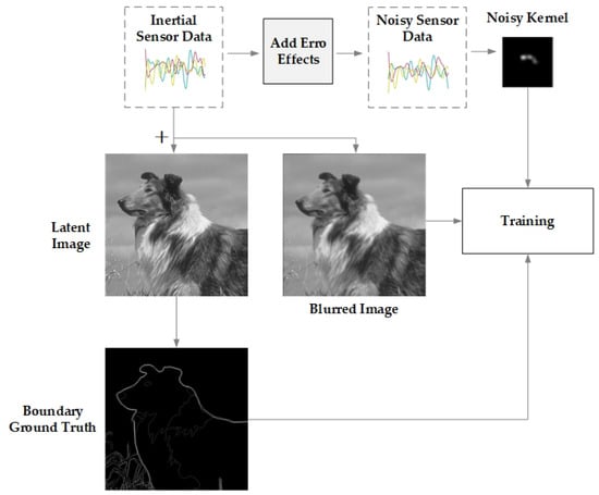 The inertial sensor data, specifically the angular velocity and the acceleration of each axis, are modeled using a Gaussian distribution with a mean of 0. The standard deviation of angular velocity of each axis is × 10−6 rad/s and rad/s; the standard deviation of acceleration of each axis is × 10−3 m2/s and × 10−5 m2/s. After randomly determining the exposure time within the range of (0.02, 0.2) seconds, we sample the sensor data within the exposure time at a frequency of . To simulate continuous motion, each sensor data sample is interpolated from the preceding data point, with angular velocity data linearly and acceleration data approximated. Utilizing the sharp images and their edges ground truth obtained from cropping the BSDS500 training set, combined with the generated sensor data, the overview of our training data generation scheme is shown in Figure 3.