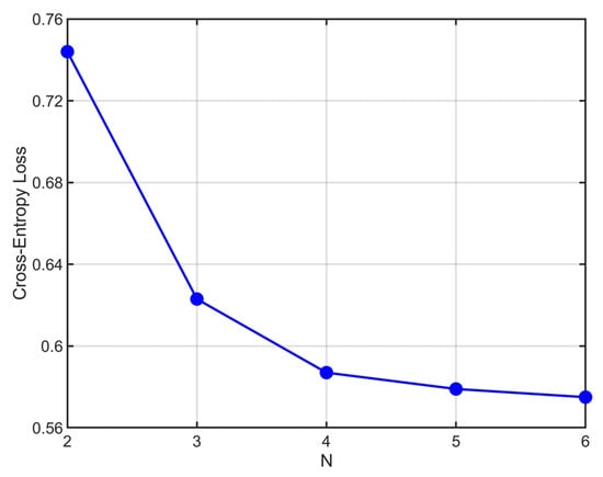 As for in Equation (9), we set for stage 0 and for later stage. The network is trained using the Adam optimizer []. The learning rate, training batch size and the number of epochs for network training are set to be 1 × 10−4, 4 and 100, respectively. The iterative parameter N has a significant impact on the performance of the approach we proposed. Therefore, we determine its value through the heuristic method. We set the value of N to range from 2 to 6 and exploit the cross-entropy loss of the final iteration with different N. Figure 4 shows the loss trend on the test set with the change of N. It can be observed that the performance improvement becomes marginal when N exceeds 4. Considering that the network architecture should not be overly complex, N is set to 4.