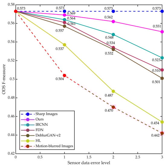 On the other hand, motion deblurring methods have been developed for improvement of the image quality but are not designed for a better edge structure perception. Recent studies have demonstrated that compared to deblurring results with lower peak signal-to-noise ratio (PSNR), deblurring results with higher PSNR do not always achieve better performance in edge detection []. Coupling deblurring algorithms with edge detection tasks and ensuring that the deblurring method can effectively improve the edge detection accuracy is another key problem to be addressed.