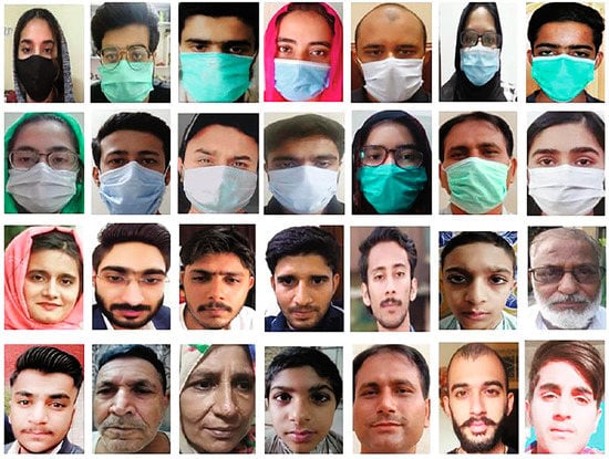 - Mundial, I.Q.; Hassan, M.S.U.; Tiwana, M.I.; Qureshi, W.S.; Alanazi, E. In Towards facial recognition problem in COVID-19 pandemic. In Proceedings of the 2020 4rd International Conference on Electrical, Telecommunication and Computer Engineering (ELTICOM), Medan, Indonesia, 3–4 September 2020; pp. 210–214. [Google Scholar]