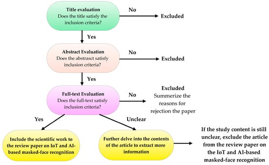 An essential step in writing the presented review paper concerns the selection of discussed and analyzed papers according to set inclusion and exclusion rules. Detailed consideration of numerous characteristics of the studied documents, such as their applicability to the themes they address, their relevance, when they were published, and whether or not they overlapped with other chosen papers, was made while defining the latter. According to the procedure shown in Figure 2, the selection approach was carried out; a three-step analysis was completed, starting with the title, moving on to the abstract, and finishing with reading the whole text.