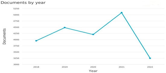 Referring to Figure 3, the highest number of documents was in 2021 (approximately 5084), beginning in 2018 with 3950 documents and terminating in 2022 with the lowest number (about 3247).