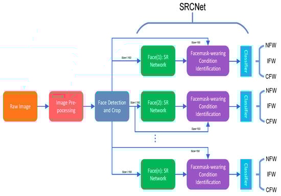 The authors of [] propose an automatic face mask recognition method constituted by an image Super-Resolution and Classifier Network (SRCNet), evaluating the performance of a three-category classification algorithm using unrestricted 2D face pictures. The SRCNet was used to identify if masks were worn (Figure 7). The obtained test results demonstrated that the proposed method reached an improved accuracy (98.70%) compared to conventional image classification techniques.