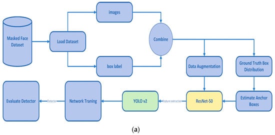 ResNet-50 is a 50-layer CNN applied to derive features. This architecture has been successfully implemented in various disciplines, such as image classification and object recognition []. The authors of [] employed the ResNet-50 model for feature extraction, while YOLOv2 was used to detect medical face masks, achieving an 81% accuracy for face mask precision detection (Figure 8a); also, Figure 8b reports the outcomes of the proposed face mask detector, reported a bounding box for each detected mask and the corresponding score.