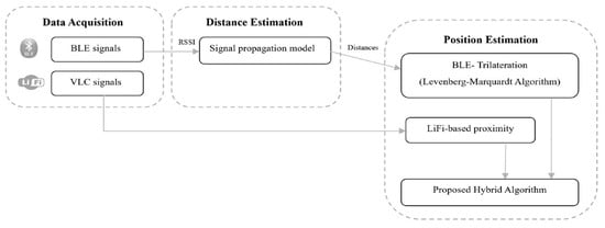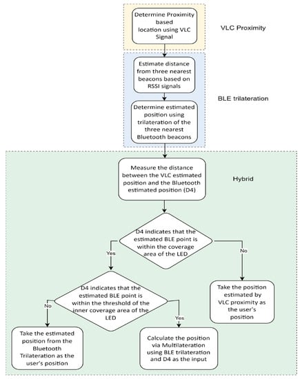 The aim behind this study was to develop a novel hybrid indoor positioning system that uses VLC with Bluetooth trilateration in order to achieve accurate indoor positioning. This section explains the steps taken to implement a system that used both technologies to achieve high-accuracy indoor positioning. The system consisted of a hybrid between a VLC-based positioning system and a Bluetooth-based positioning system. The system started with data acquisition from the VLC system and the BLE system. The VLC system estimated the location of the receiver based on modulated information sent by the light source, which was then picked up and demodulated at the receiver’s side as a distinct identifier code, and then the Bluetooth system detected the location of the receiver using an RSSI-based trilateration technique. After the results from both systems were calculated, the distance between the VLC and the BLE estimated position was calculated to be used as a fourth triangulation point to calculate the position. The exact steps for building the proposed system are presented below in Figure 1.