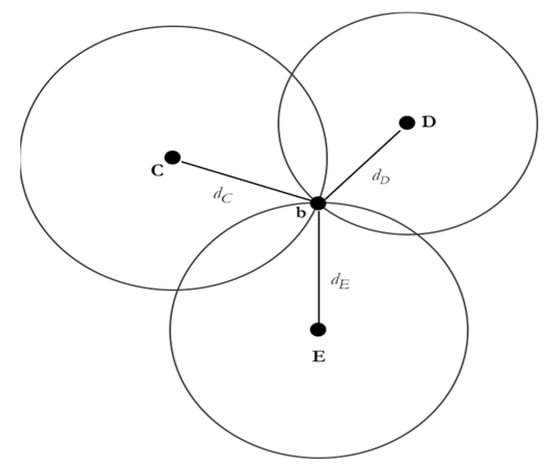 The RSSI signals from the Bluetooth beacons were converted into spatial distances, which were used as the radii of circles. The distance from each beacon was calculated. As shown in Figure 2, the trilateration algorithm calculated the coordinates of the intersection of those distances (circles) based on the received signal strength of each signal.