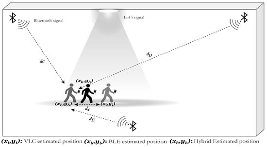 In Equation (6), we present the scenarios in a mathematical format, where represents the distance between the BLE-estimated position and the LED, where (xh, yh) is the hybrid position, (xi, yi) is the VLC-estimated position, (xb, yb) represents the position estimated by BLE, and (xm, ym) is the position estimated by multilateration.