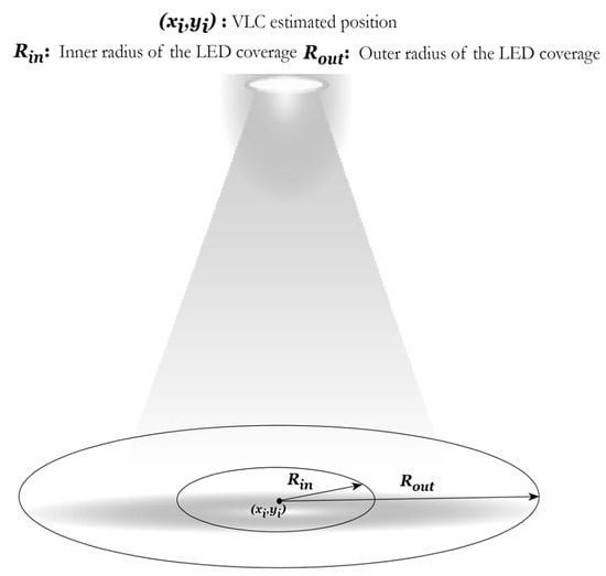 The methodology of the hybrid system is presented here in detail. As shown in Figure 3, the initial estimated position (xi, yi) was estimated using VLC, and the (xb, yb) position was estimated using Bluetooth trilateration. A new position estimation method that used both technologies was created that worked by calculating the distance between (xi, yi) and (xb, yb), also known as (the 4th distance), since we had three distances from the Bluetooth beacons using the trilateration system. was an estimate of the position between the user’s BLE-based position and the center of the LED (xi, yi). This distance could be used as a notation to the system if the user was closer to the center, the edges, or the outside of the area covered by the LED. When denoted that the user was estimated to be closer to the center of the LED, or in other words, the user was inside the inner radius area shown in Figure 4, then was used for multilateration to assume a new position (xm, ym). In the case that denoted that the user was inside the area covered by the LED but closer to the edges (or in the outer radius area), then the appropriate action was to take the estimated position from the BLE system. Lastly, when denoted that the user was outside the coverage area of the LED even though the LED signal was picked up by the device, the BLE system assumed a position with a bigger error value than the coverage area of the LED, and the user was then assumed to be under the LED and given the value (xi, yi) of the center of the LED, which gave an error of the coverage area of the LED or less. These scenarios are presented in brief in Table 2 below.
