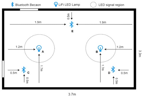 In the first space, two light fixtures labeled A and B were set up to send VLC signals, and three Bluetooth beacons were distributed in the 3.7 × 3.3 × 3 m room. The three Bluetooth beacons, labeled C, D, and E, were placed in fixed locations within the room. Similarly, the two LEDs were also placed in fixed locations. This setup allowed for reliable experimental conditions and data collection. To act as the user’s device in the experiment, an Android mobile phone named River 1, provided by the Saudi company Azom [], was used. The dimensions of the area and the distribution of the equipment in the first environment are shown in Figure 7. The parameters of the experiment are displayed in Table 3. A detailed explanation of the hardware and software specifications used in the experiment is given in the following sections: By meticulously designing the experiment space with specific hardware and software components, we were able to create a controlled environment for the experiments and obtain reliable data.