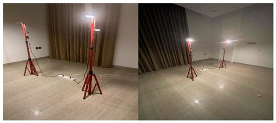 In this experiment, two test spaces were used in order to evaluate the performance of Bluetooth positioning in both smaller and larger areas. Both spaces had almost no interference for either Bluetooth or VLC. Based on the tools available as well as the layout of the available spaces, while trying to ensure feasibility and practicality, we designed the experiment as follows: Two LEDs at a height of 1.5 m covered a diameter of about 1 m and an area of about 0.79 m2. The LEDs did not intersect in any scenario since they were placed more than 1 m apart, with three BLE beacons in fixed placements. As shown in Figure 6, the use of these fixed placements allowed for a more controlled testing environment, ensuring that any variations in the results could be attributed to factors such as the size of the testing environment and not obstacles or changes in equipment. Overall, the similarity in design between the two testing environments provided a comprehensive platform for evaluating the performance of the positioning system, particularly in scenarios where the size of the testing environment varied.