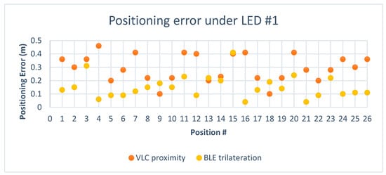 Positioning error under LED #1 for BLE and VLC in the second environment.