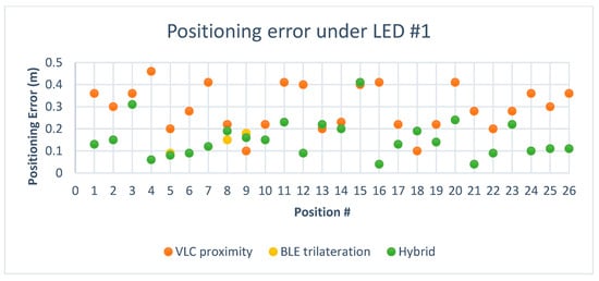 - The hybrid system worked by using either VLC proximity or BLE trilateration or a multilateration of both, depending on the value of the distance between the estimated position of the user’s device and the LED (). This meant that in the worst case, accuracy would be limited by the value of the outer radius of the coverage area of the LED, which was 0.50 m.