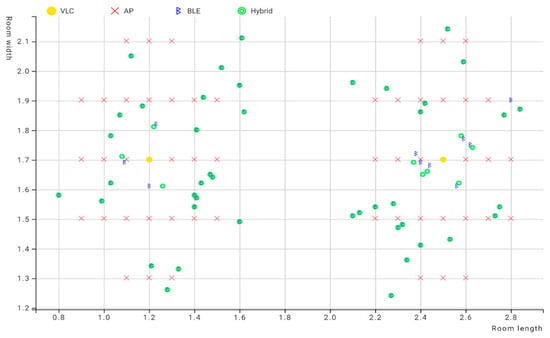 We decided to extend the experiment into a larger scene to examine it further under more realistic conditions. Similar to the first experiment, 52 positions were marked to be estimated in a larger room where the same environment was duplicated to ensure the experiment had the same parameters and setup in regards to LED heights, beacon placement, and physical obstacles. The only difference was the size of the room, which was 6.7 × 5.4 × 3 m3. Similar to the first experiment, each of the 52 positions had 10 readings for Bluetooth and was under the coverage of the LED.