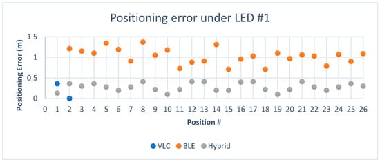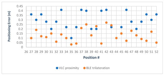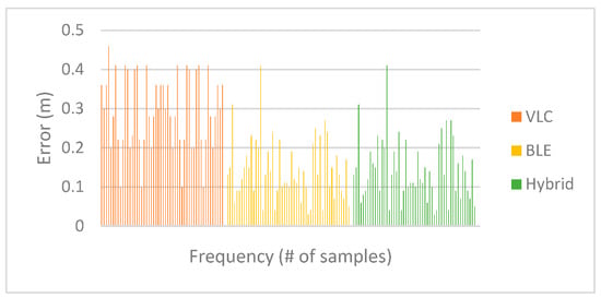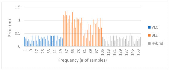 Figure 20 shows the positioning error for the hybrid system in comparison to BLE and VLC. As shown, the hybrid system favored the VLC technology due to the higher error rate in BLE in the larger environment.