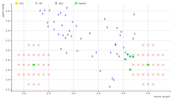 - In the second environment, the room was larger, which caused more fluctuations in RSS signals and less accurate BLE positioning. The hybrid system leaned towards VLC positioning because of the higher error value in positioning, which led to larger values of . The hybrid system achieved the optimal solution in 96.2% of the positions in this area.
