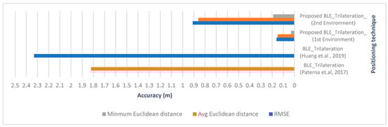 A2. As proved by the literature and shown in Figure 24, BLE trilateration does provide accurate results for indoor positioning. It was shown in [] by Paterna et al. that a system that uses Bluetooth trilateration with frequency diversity and Kalman filtering was able to achieve an average error of 1.82 m in a 9.19 m × 6.18 m room. Moreover, in [], Huang et al. achieved an accuracy of 0.76 m using a hybrid method of trilateration and dead reckoning.