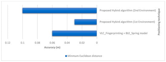 To evaluate the quality of accuracy in the proposed system, we compared it against the existing literature for Bluetooth, VLC, and hybrid systems. Therefore, we calculated the positioning error using Euclidian distance, the average error, and the maximum and minimum error, as shown in Table 8 and Table 10, along with the Root Mean Square Error of each technology for each environment, as shown in Table 11.