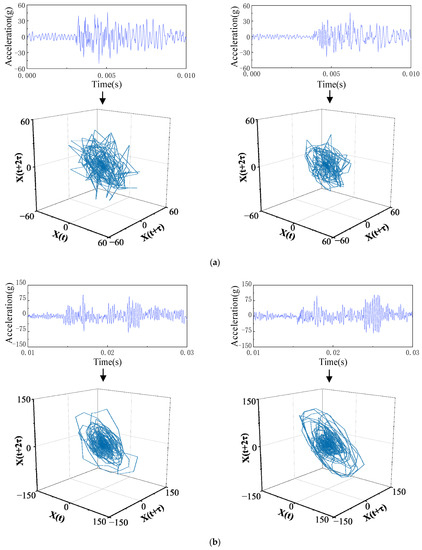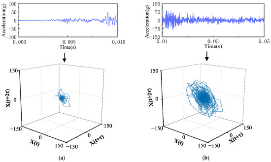 Results of the phase-space reconstruction of the vibration signal under normal and defect closing. (a) NC state. (b) LCE state.