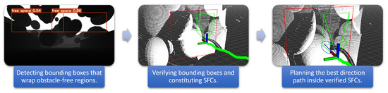 We propose a hybrid approach to retain the advantages of a learning-based method and remove its false predictions by a lightweight depth-based verification. First, we train a deep-learning model to predict bounding boxes that wrap obstacle-free regions directly in a depth image. Next, we verify the predictions by rejecting collided bounding boxes at every depth and then searching for the maximum depth possible for the remaining. Finally, we plan the best direction path (blue segment) toward the goal that satisfies SFC constraints. Therefore, no sampling job is needed. We call the process a hybrid because the verification is a non-learning technique, involving a classical search-based algorithm. The workflow of the planner is outlined in Figure 2.