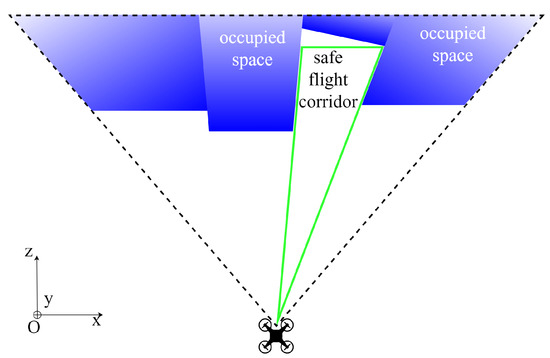 We define our SFCs in a pyramid-shaped form to take advantage of the depth image characteristics. One of the features of depth images is that, when deprojecting it into space, a segment connecting the optical center to any pixel does not intersect any segment connecting the optical center to any other pixel. Therefore, any plane parallel to the sensor frame and not obscured by any pixels will be collision-free. Additionally, any segment connecting the optical center (the robot’s position) to any point on that plane will also be collision-free. If the plane is rectangular, we can constitute a rectangular pyramid SFC with its apex located at the robot’s location , and the base perpendicular to the z-axis of the depth camera-fixed frame, as visualized in Figure 3.