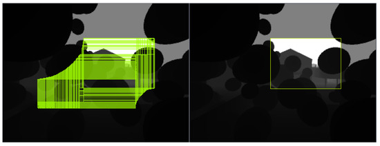 We collect training data from both the flight simulator and the actual environment. We run the planner in our previous work [37] in the Flightmare drone simulator [38] and capture depth images at the resolution of 320 × 240 from a simulated onboard camera. We then label a bounding box representing the base of a rectangular pyramid SFC by a modified version of the depth-based inflating algorithm in [12] in which we brute-forced search all pixels in the frame. That exhaustive inflating method generally outputs overlapping bounding boxes in the frame without concerning obstacle density, as illustrated in Figure 5.