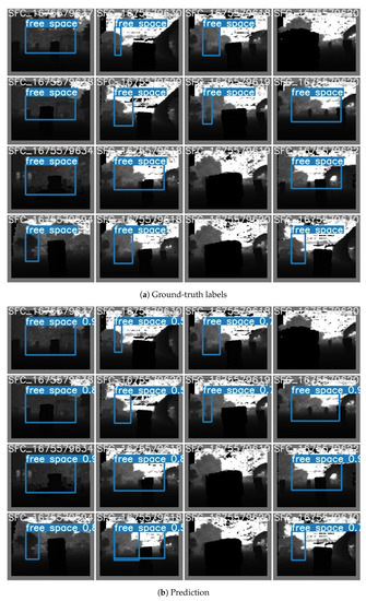 Training hardware must support the Pytorch framework (Pytorch https://pytorch.org/, accessed on 1 June 2023) as required by Yolov7. We train the model in our available local server with an NVIDIA GeForce GTX 1080 Ti 11 GB GDDR5X. Our model will be transfer-learning trained from the yolov7-tiny.pt, which is the checkpoint of a Yolov7 tiny pre-trained model with the COCO dataset. The training configuration will be 64 samples per batch and 150 epochs. Given the Intersection over Union (IoU) threshold of 0.5, the trained model achieves a prediction accuracy of 94.9%, recall of 92.9%, mean average precision at IoU 0.5 (mAP@0.5) of 96.1% and mAP@0.5:0.95 of 80.9% on the test dataset. Free space prediction results on the test set are visualized in Figure 7. Predicted SFCs are reasonably similar to the ground truth.
