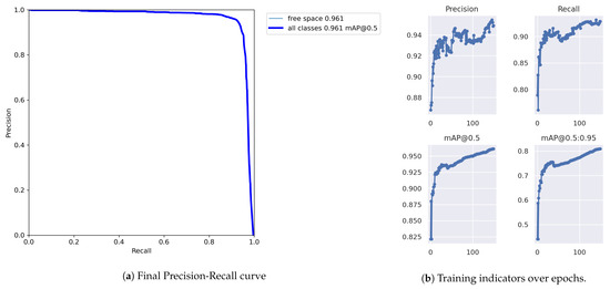 As illustrated in Figure 8, the precision, recall, and mAPs converged to stable values over training epochs. Since we have only one class of object, the precision-recall (P-R) curve for the free space class coincides with the global P-R curve for all classes. The P-R curve profile shows that the precision approached 1 when the recall approached 0 and vice versa, maximizing the integral of the area under the P-R curve, which is the mAP@0.5 of 96.1%. It takes about 40 ms to infer an image on Jetson Xavier NX and an average of 8 ms on a laptop GPU.