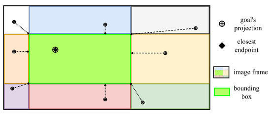 where , , and are the world-frame positions of the vehicle, the goal, and the best path’s endpoint we need to find, respectively. is the vector of exploration direction. This vector-based function corrects the velocity vector to the desired direction. In our proposed system, will be the unit vector from the vehicle’s current position to the goal. The reward is simply the dot product of the exploration vector and the unit vector of the path, i.e., the direction of a better path will align closer to the goal direction. With p and g, respectively, as the projections of and in the image plane, we can see that is at its maximum when the distance between p and g is minimal. With rectangular bounding boxes as constraints, our problem will be a 2D geometry issue: find the point p inside bounding boxes so that the distance is minimal. We have the coordinates of the goal and its projection in the camera frame calculated as follows,