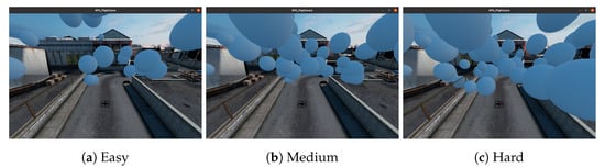 We test our proposed navigation planning system, which we now call FSD planner—Free Space Detection planner for brevity, on a simulation system (Our simulation system source code is available online at https://github.com/thethaibinh/agile_flight/tree/fsd, accessed on 1 June 2023) from DodgeDrone Challenge 2022 [38]. The challenge is to navigate a quadrotor through the obstacle-dense area to a 65 m far ahead goal. For the convenience of auto evaluation, we modify the scenario to be a quadrotor flying through a 15 m route to a goal with obstacles along the route. The flight area is a 3D bounding box with sizes of [0, 15, , 5, 0, 10] (meters) in a frame system with the axis and parallel to the ground and pointing upwards, in which the robot is at the origin, and the goal is at [17, 0, 5]. Obstacles are solid spherical balls of different diameters ranging from 0.1 to 4.0 m, stationary, and randomly generated inside the bounding box. There are three levels of challenge based on the density of balls in space: Easy, Medium, and Hard, with 29, 51, and 67 balls in the test box, respectively. Figure 11 capture a typical scenario with additional visualization of point cloud ground truth. All obstacles of the easy scenario are already included in the medium scenario, and the hard scenario has all the medium obstacles in its configuration. A trial will be labeled successful when the robot reaches the goal’s position before the timeout and does not collide with any obstacle.