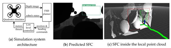 We train a separate model for use in the simulation by synthetic data also saved from the same simulator. We flew a couple of trials by the planner in our previous work [37] and captured synthetic depth images along the routes. We then labeled them and trained the model using the method mentioned in Section 4.4. The classical nested feedback loops [39] will be integrated as a low-level controller who receives position guidance commands in a receding horizon manner. We limit the maximum desired velocity to 1 m/s, mitigating control uncertainty because we only focus on SFC evaluation. Figure 12a describes an overview of the simulation system, mapping out the planner architecture sketched in Figure 1. All member components in the simulation system are software and will be run on the desktop environment. Figure 12b,c visualizes predicted SFCs in the current depth frame and corresponding local point cloud.