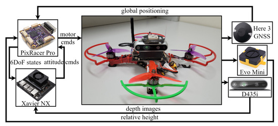For real flight tests, we build a 250 mm wheelbase experimental quadrotor that houses a GNSS module for obtaining global localization, a TeraRanger Evo Mini altimeter for relative altitude feedback, and a stereo camera. Mapping with the planner architecture described in Figure 1, the positioning system will be a Here 3 GNSS module, the depth camera will be an Intel RealSense D435i, and the position-tracking controller will be implemented in a companion computer Jetson Xavier NX. The quadrotor also has a PixRacer Pro flight controller for running low-level orientation tracking controllers and 6DoF state estimation. The embedded onboard computer Jetson Xavier NX runs the FSD planner and the position-tracking controller, similar to the simulation system. The drone architecture is outlined in Figure 13.