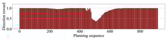 Results of calculated path’s direction rewards show that the path-planning algorithm works effectively on generated SFCs. When the robot is in front of a large free space, reward values are always 1 (maximum). They only decrease to a lower value when the vehicle is steering away from an obstacle on the route. Reward values saved from a trial are illustrated in Figure 16.