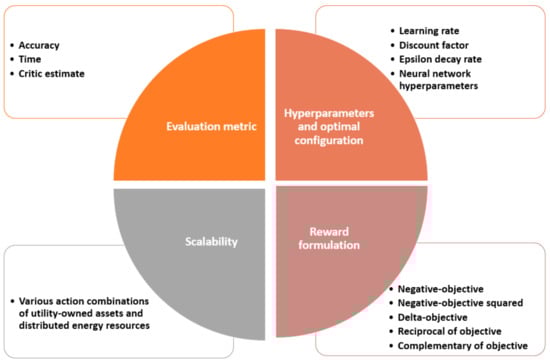 This paper examines the impact of DRL reward representations and hyperparameters on the agent’s learning performance when solving the ORPD problem for ADNs. We assess the agent’s performance in regard to accuracy and training time metrics, as well as critic estimate measures. Furthermore, different environmental changes are examined to study the scalability of the DRL model. To the best of our knowledge, no published work has addressed all these aspects of the proposed solution, i.e., DRL for ORPD in ADNs. The work in papers [48,49,50] focused on analyzing the reward shaping adversity. Different reward formulations for point-goal navigation and bidding applications are assessed in papers [48] and [49], respectively. In addition, to reward function analysis, the authors of paper [50] exploited different environments observing the accuracy and time of convergence. On the other hand, the work in papers [51,52] investigated RL hyperparameters. The authors in paper [51] employed a robot confrontation and a maze walker problem and studied the influence of the learning rate hyperparameter. They also demonstrated the average rewards and convergence of such problems. While in paper [52], the authors discussed the effect of the discount factor and the number of neurons of the neural network (NN) hyperparameters for the navigation of unmanned aerial vehicles as mobile base stations for long-term communication coverage. They also examined the performance of the RL agent for different numbers of these vehicles. Table 1 summarizes the main differences between the analysis performed in this paper and the recent RL-related analysis in other domains, and Figure 1 addresses the core values of the presented work. From Table 1, it can be observed that research works either focused on studying the effect of reward shaping on the agent performance or examining the hyperparameters of their problem with respect to the commonly used agent evaluation metric, namely, its accuracy. Although the agent’s accuracy in achieving its objectives is essential, it is crucial to highlight that examining the critic estimate, which resembles the long-term future reward and its progression throughout the training process, significantly impacts the agent’s performance. It is worth noting that the analysis of the critic estimate has not been studied before in works that assess RL agent performance in the power system field or other fields.