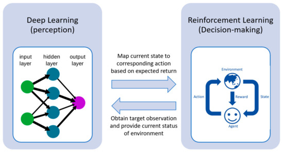 DRL integrates the perceived role of deep learning within the decision-making of RL. Figure 2 illustrates the framework of DRL. Deep learning obtains the target observation information from the environment and provides the state information in the current environment. The RL then maps the current state to the corresponding action and evaluates values based on the expected return [33]. The progress from RL to DRL has gone through a long development process. In classical tabular RL, e.g., the Q-learning approach, for small-scale state and action spaces, the representation of approximate value functions as arrays or tables is efficient. In this case, the methods can often find the exact optimal value functions and the optimal policies [43]. However, conventional RL approaches suffer from the ‘curse of dimensionality’ in real-world problems comprising of large-scale continuous action and/or state spaces. Deep NNs overcome this issue by providing compact low-dimensional representations of high-dimensional inputs [15], where the approximate value functions are represented as a parameterized functional form with a weight vector instead of a table. DRL can handle complicated tasks with lower prior knowledge due to its ability to learn levels of abstractions from data [40].