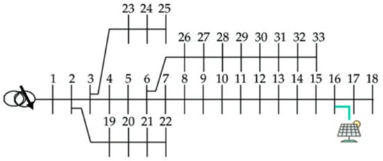 In this paper, we solve the ORPD by a DRL with a deep Q-network (DQN) and analyze its performance. The ORPD-DQN-based algorithm is tested on a modified IEEE 33-bus system, as shown in Figure 3. A PV plant is installed at bus 16 with a 0.6 MVA inverter rating. The distribution network peak demand is 8.0 + 2.6 MVA, the substation voltage at bus 1 is 1.04 p.u (12.67 kV), and the minimum and maximum voltage limits are 0.95 p.u and 1.05 p.u, respectively. Table 2 lists the considered parameter settings of the system. Data of residential active power over one year from paper [53] is used as the training dataset. The RL algorithm is implemented on MATLAB using the Reinforcement Learning Toolbox [54], and the power flow calculation is based on MATPOWER 7.1 [55].