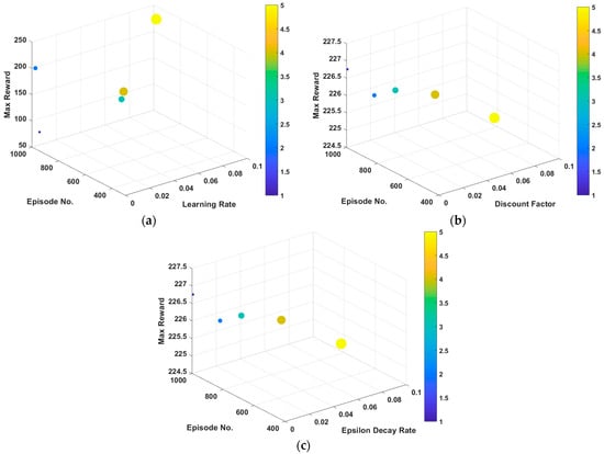RL-agent hyperparameters analysis of maximum reward, , and episode number, concerning change in (a) learning rate; (b) discount factor; and (c) epsilon decay rate.