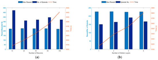 NN-hyperparameters analysis of maximum reward, , episode number, , and training time concerning change in (a) the number of neurons in each layer of the NN; and (b) the number of NN hidden layers.