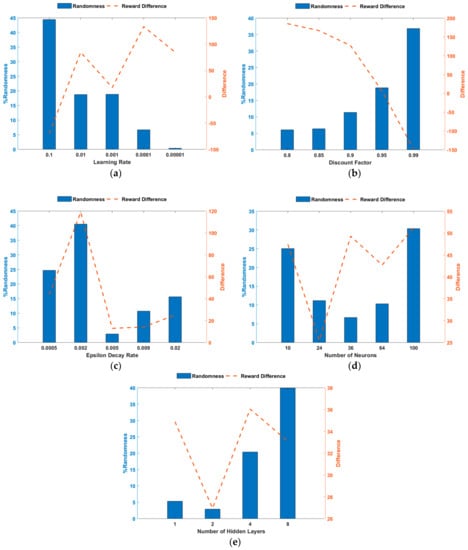 The performance of the DRL agent highly depends on various parameters. The key sensitive parameters are the RL agent hyperparameters and the NN model parameters. Hyperparameters include the learning rate (LR), which controls the rate at which the NN learns the problem; the discount factor (DF), which manages the importance of future rewards over immediate rewards; and the є-greedy decay rate (EDR), which controls the balance of exploration and exploitation. NN parameters include the number of nodes in the hidden layers and the number of hidden layers in the model.